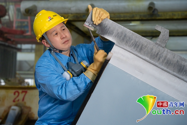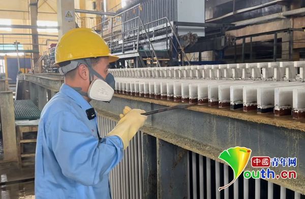 柳祥國在檢查陰極板導(dǎo)電頭。中國青年網(wǎng)記者 高蕾 攝