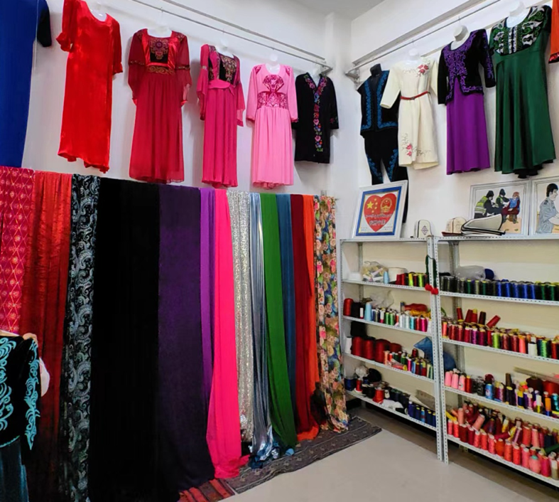 托云牧場積極鞏固政策支持,集中力量打造項目驅動,有效推進地方產(chǎn)業(yè)集群的全面發(fā)展,實現(xiàn)經(jīng)營集約化與產(chǎn)業(yè)高效整合。2015年,由牧場“刺繡巧匠”吐孔·沙熱牽頭并成功注冊了“托云牧場帕米爾刺繡”合作社。到了2019年,牧場成功申請到160萬元援疆資金,用于建設新的手工刺繡產(chǎn)品生產(chǎn)基地。在吐孔·沙熱的帶動下,合作社目前擁有60名成員,其中43名技藝嫻熟的繡工,年總收入攀升至三十萬。該合作社通過直銷、與克州百來思服裝店的業(yè)務合作,以及接受附近學校的校服訂單等多種渠道,將其生產(chǎn)的床品、家居布藝、女性服裝及校服推向阿圖什市、烏恰縣等地區(qū)市場。