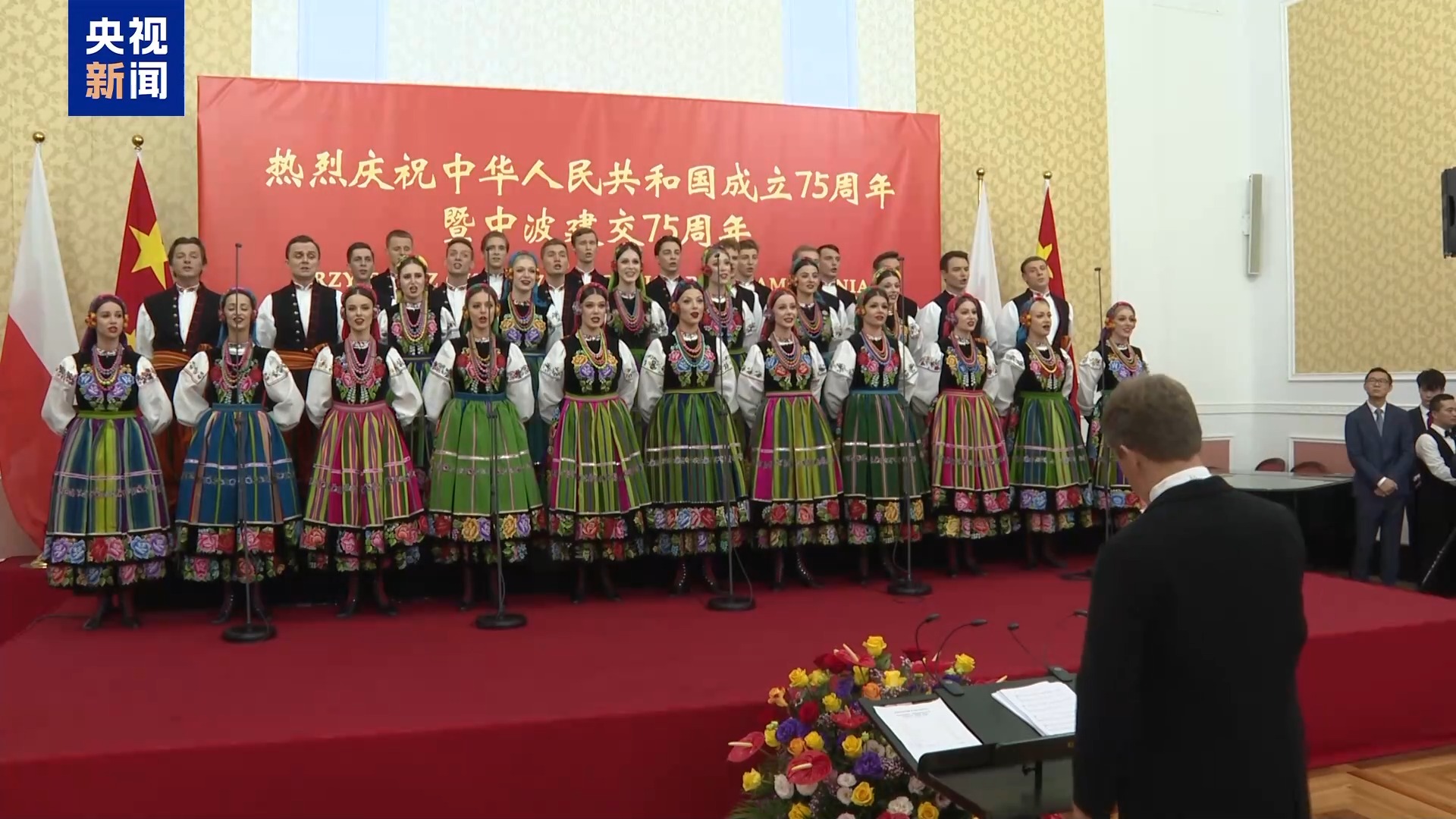 中國駐波蘭大使館舉行的國慶招待會(huì)上,波蘭政要、各國駐波使節(jié)、華僑華人代表等約600人出席。中國民樂藝術(shù)表演和留學(xué)生歌唱團(tuán)帶來豐富表演,波蘭馬佐夫舍歌舞團(tuán)也呈現(xiàn)了波蘭民族歌舞表演,特別是一首中文歌曲《半個(gè)月來爬上來》將招待會(huì)氣氛推向高潮。