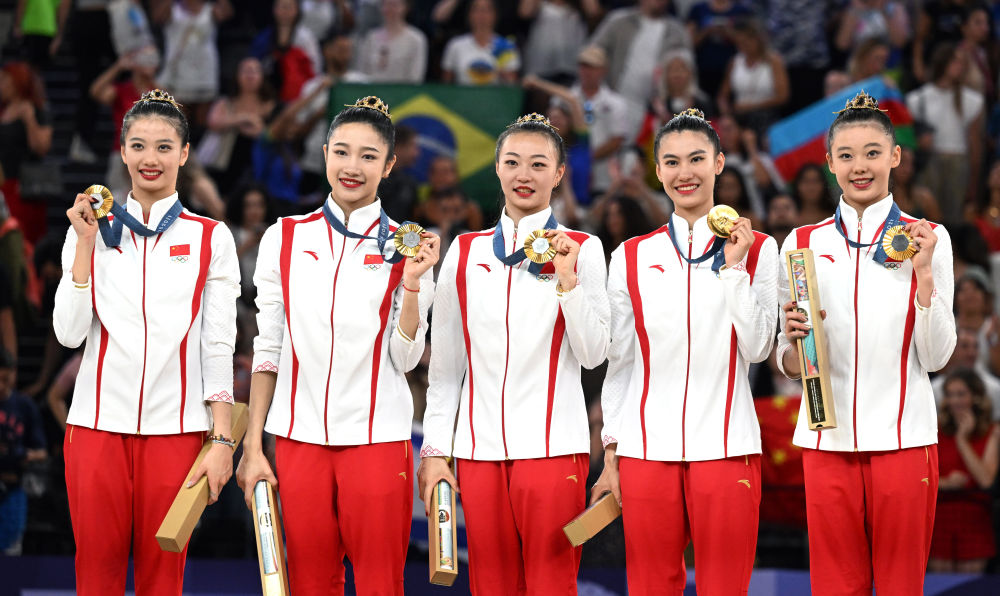 8月10日,中國隊在頒獎儀式上。當日,在巴黎奧運會藝術體操項目集體全能決賽中,中國隊獲得冠軍。新華社記者 程敏 攝