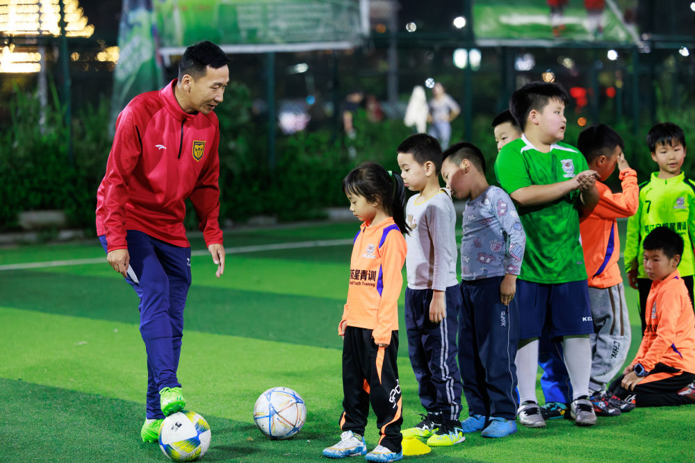 4月8日,董永恒(左一)在對榕江縣的小球員進行培訓。新華社記者 劉續(xù) 攝