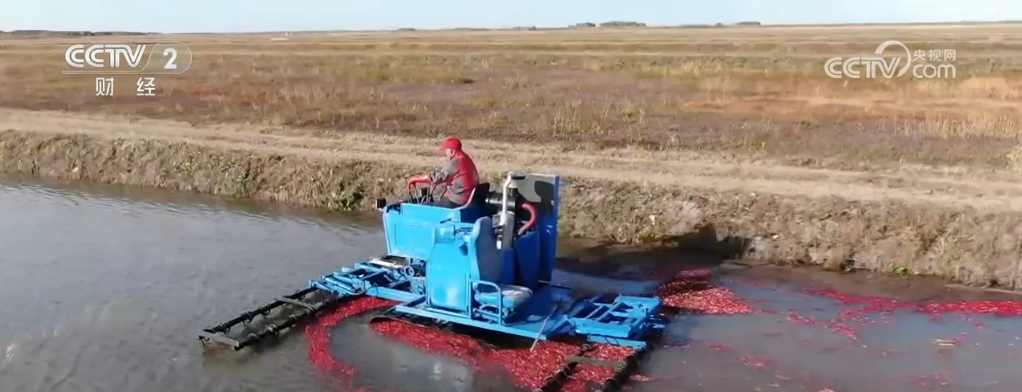 成熟的蔓越莓怎么收獲呢?轉(zhuǎn)過來看這里,這就是記者所說蔓越莓的地塊為什么像池塘,因為這里灌進水,工作人員就駕駛著采收機就可以收獲了,采收機上有兩排鋼條,它能將水里的蔓越莓從植株上脫落下來。因為蔓越莓里面是空心的,所以能夠浮在水面上。我們看,采收機走過之后,后面的蔓越莓就漂上來了。工作人員只需要來回多次的行駛,就可以把成熟的果子都收獲下來,這種方式收獲率可以達到97%以上。每個地塊都這么大,飄在水上的蔓越莓怎么才能收回來呢?工作人員在水里用木板把這些蔓越莓聚攏到一起,再通過提升機就可以裝到車廂里了。每到蔓越莓收獲的季節(jié),田里就變成了紅色的海洋,非常漂亮。