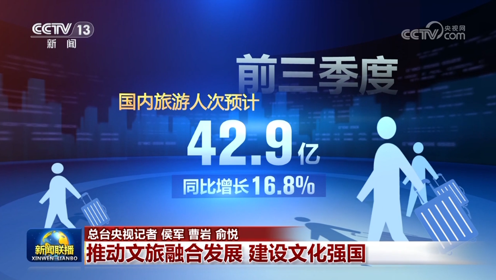 今年上半年,規(guī)模以上文化及相關(guān)產(chǎn)業(yè)企業(yè)實(shí)現(xiàn)營(yíng)收近6.5萬(wàn)億元,同比增長(zhǎng)7.5%;前三季度,國(guó)內(nèi)旅游人次預(yù)計(jì)達(dá)42.9億,同比增長(zhǎng)16.8%;入境旅游人次預(yù)計(jì)達(dá)0.95億,同比增長(zhǎng)55.4%,更多外國(guó)民眾來(lái)華旅游,體驗(yàn)賓至如歸、感受美好中國(guó)。