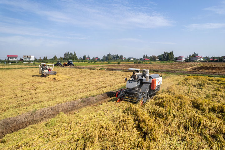 10月2日,湖南省益陽市南縣麻河口鎮(zhèn)蔡家鋪村村民開展水稻機械收割作業(yè)(無人機照片)。新華社記者 陳思汗 攝