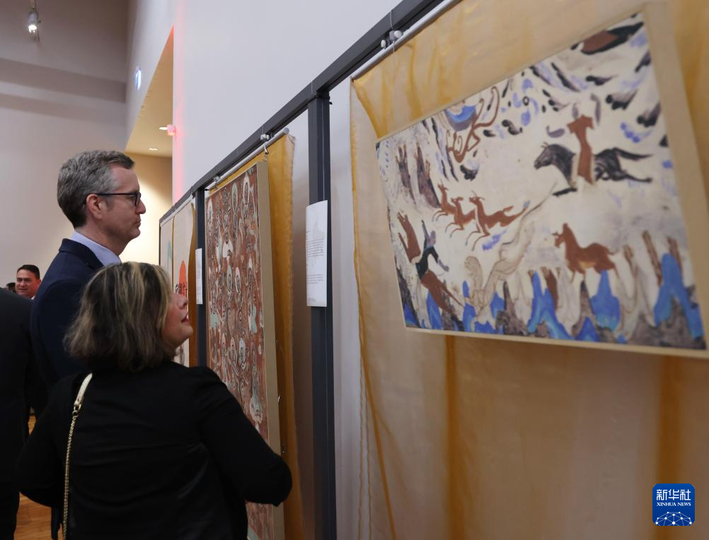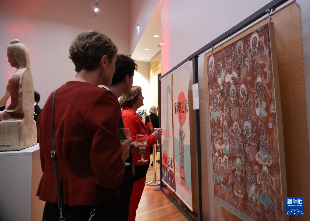 9月26日晚,在新西蘭首都惠靈頓舉行的中國駐新西蘭大使館國慶招待會(huì)上,嘉賓們駐足觀看敦煌文化展。新華社發(fā)(孟韜攝)