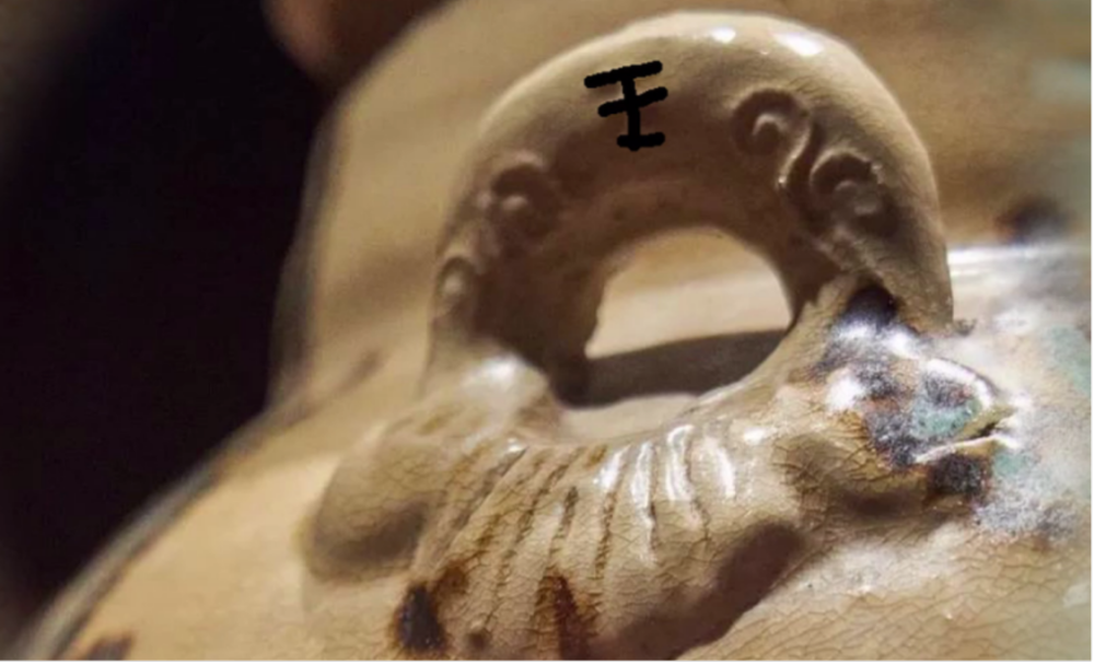 青釉褐綠點(diǎn)彩云紋雙耳罐的罐身印有“王”的字樣。圖片來源:揚(yáng)州日?qǐng)?bào)社