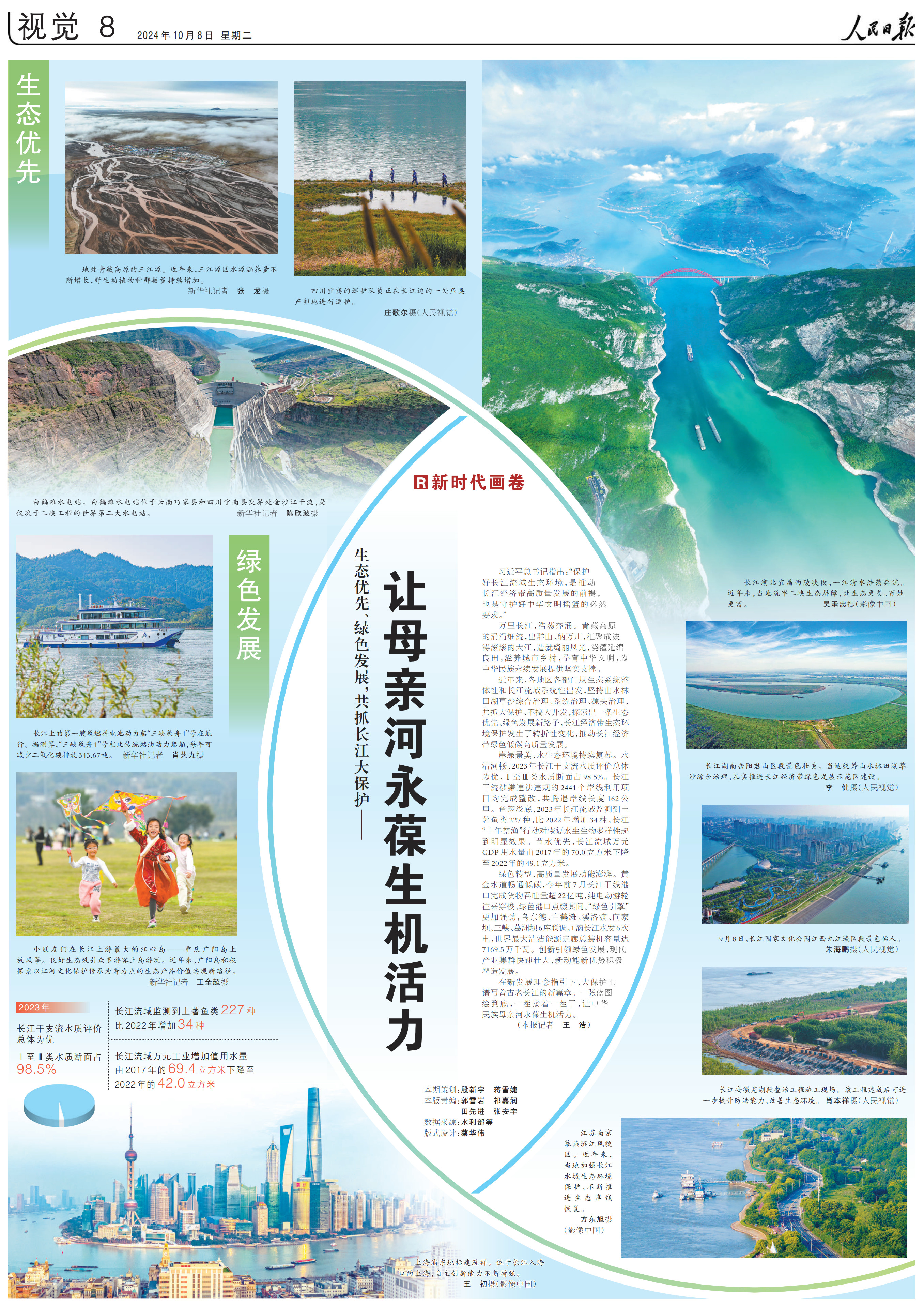 岸綠景美,水生態(tài)環(huán)境持續(xù)復(fù)蘇。水清河暢,2023年長(zhǎng)江干支流水質(zhì)評(píng)價(jià)總體為優(yōu),Ⅰ至Ⅲ類(lèi)水質(zhì)斷面占98.5%。長(zhǎng)江干流涉嫌違法違規(guī)的2441個(gè)岸線(xiàn)利用項(xiàng)目均完成整改,共騰退岸線(xiàn)長(zhǎng)度162公里。魚(yú)翔淺底,2023年長(zhǎng)江流域監(jiān)測(cè)到土著魚(yú)類(lèi)227種,比2022年增加34種,長(zhǎng)江“十年禁漁”行動(dòng)對(duì)恢復(fù)水生生物多樣性起到明顯效果。節(jié)水優(yōu)先,長(zhǎng)江流域萬(wàn)元GDP用水量由2017年的70.0立方米下降至2022年的49.1立方米。