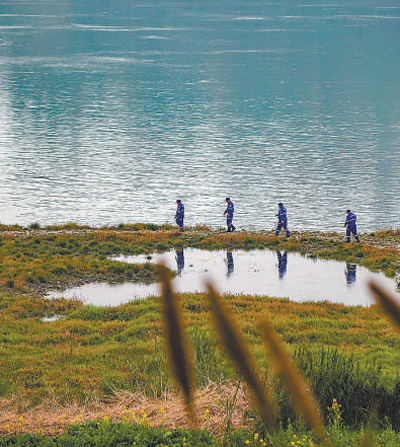四川宜賓的巡護(hù)隊(duì)員正在長(zhǎng)江邊的一處魚(yú)類(lèi)產(chǎn)卵地進(jìn)行巡護(hù)。莊歌爾攝(人民視覺(jué))