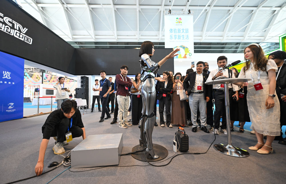 會展搭建師在天津舉辦的中國文化旅游產(chǎn)業(yè)博覽會現(xiàn)場維護(hù)AI機(jī)器人互動設(shè)備(9月13日攝)。新華社記者 孫凡越 攝