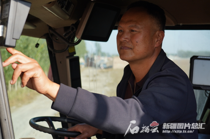 10月10日,何洪濤在采棉機駕駛室內調設備。孫志坤 攝