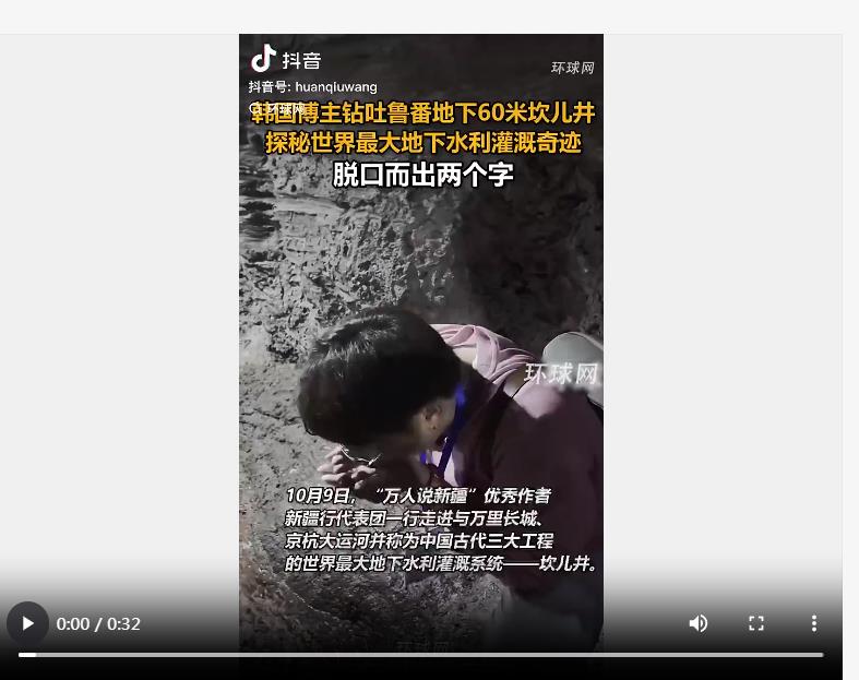 10月9日,韓國(guó)博主樸大一跟隨“萬(wàn)人說新疆”優(yōu)秀作者新疆行活動(dòng)來到吐魯番,探秘世界最大地下水利灌溉奇跡——坎兒井,瞬間被中國(guó)古代灌溉文化的博大精深所震撼!他由衷贊嘆道:“這井不一般,‘地下運(yùn)河’的水真甜!”