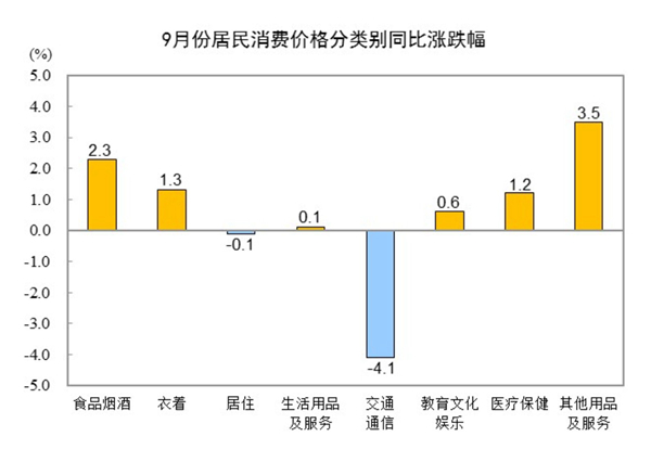 9月份,全國居民消費價格環(huán)比持平。其中,城市下降0.1%,農(nóng)村上漲0.1%;食品價格上漲0.8%,非食品價格下降0.2%;消費品價格上漲0.2%,服務(wù)價格下降0.3%。