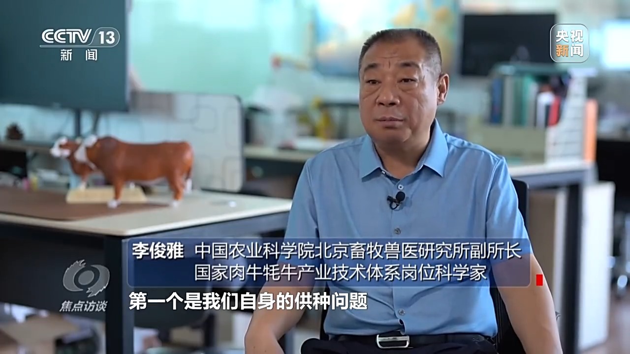 中國農業(yè)科學院北京畜牧獸醫(yī)研究所副所長、國家肉牛牦牛產業(yè)技術體系崗位科學家 李俊雅:“核心種源依然依靠進口,存在很多問題,一是我們自身的供種問題,在特殊時期,如果我們不能從國外進口相應的優(yōu)秀種質,我該怎么做;另外,我們引的這些國外的品種基本上都不是本品種的最優(yōu)秀種?;蛘叻N牛的凍精。我們必須要培育出滿足我們國家主流市場供給型的品種。