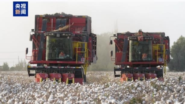 這兩天,盛開(kāi)的棉花猶如白雪連成一片,兩臺(tái)大型采棉機(jī)穿梭其間,通過(guò)采摘、收集、打包、出倉(cāng)完成棉花采收工作。