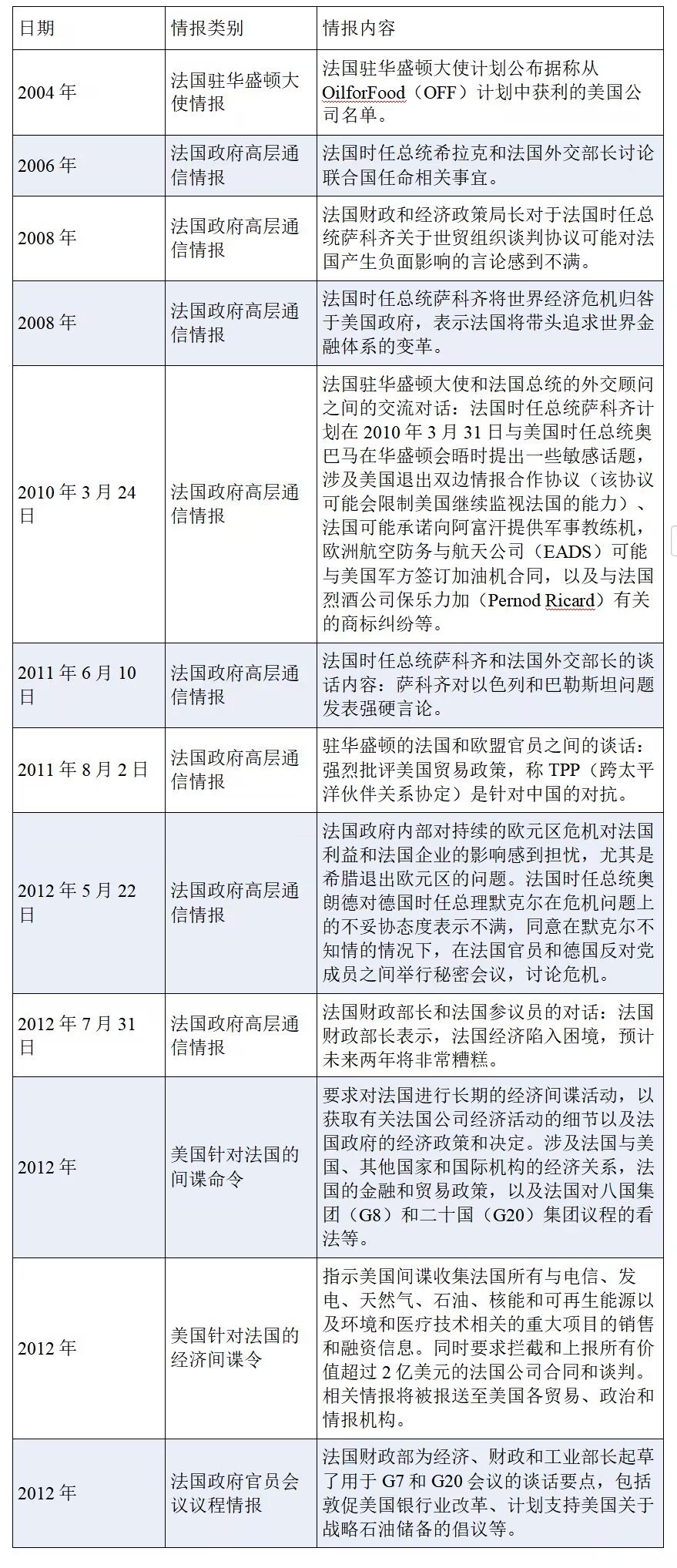 在2004年至2012年期間,美國對法國實施了長期的間諜行動,監(jiān)聽對象包括前法國總統(tǒng)、法國財政部長、法國外交部長、法國參議員、法國財政和經濟政策局官員、法國駐美國大使,以及直接負責歐盟貿易政策的官員等。監(jiān)聽內容涉及法國政府政策、外交、金融、國際交流、基礎設施建設、商業(yè)和貿易活動等,其中一些重要情報被美國授權與“五眼聯盟”伙伴國家共享,揭示了“五眼聯盟”國家亦為美國間諜行動的獲益者。