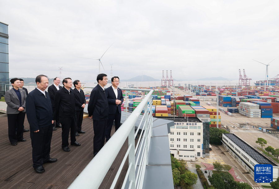 10月15日至17日,中共中央政治局常委、全國(guó)政協(xié)主席王滬寧在浙江省寧波市、溫州市調(diào)研。這是16日上午,王滬寧在寧波舟山港穿山港區(qū)了解生產(chǎn)運(yùn)營(yíng)和自由貿(mào)易試驗(yàn)區(qū)建設(shè)情況。新華社記者 王曄 攝