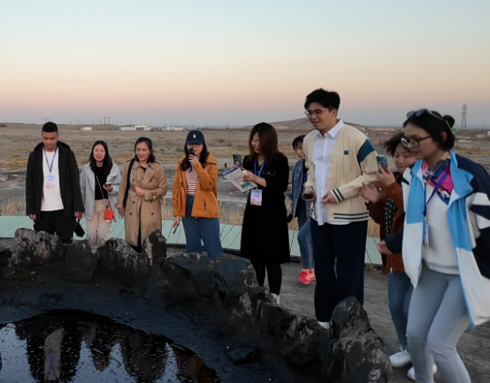 在黑油山最著名的景點(diǎn)——“跳跳泉油池”,黑油山景區(qū)講解員麥爾哈巴·肉扎洪帶領(lǐng)訪問團(tuán)代表們利用壓力傳導(dǎo)作用,在它的周圍邊喊邊跳,眼見著它冒的泡泡越來越多,讓大家興奮不已。麥爾哈巴·肉扎洪說:“經(jīng)過三代人的努力,克拉瑪依變成了現(xiàn)在這樣宜居宜業(yè)宜游的現(xiàn)代化高品質(zhì)城市,希望可以把克拉瑪依艱苦創(chuàng)業(yè)的精神傳達(dá)給大家,也可以把這種活力傳達(dá)給大家。”