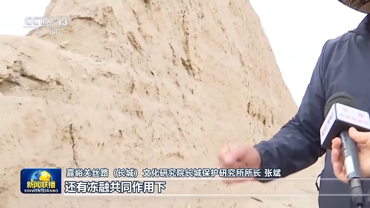嘉峪關(guān)絲路(長城)文化研究院長城保護研究所所長 張斌:這塊就是風雪,還有凍融共同作用下,形成一個很深的掏蝕凹槽,可能掏蝕進去20多公分,所以我們通過對它進行日常維護,就是對它進行夯補,它這個墻體的穩(wěn)定性就好了。