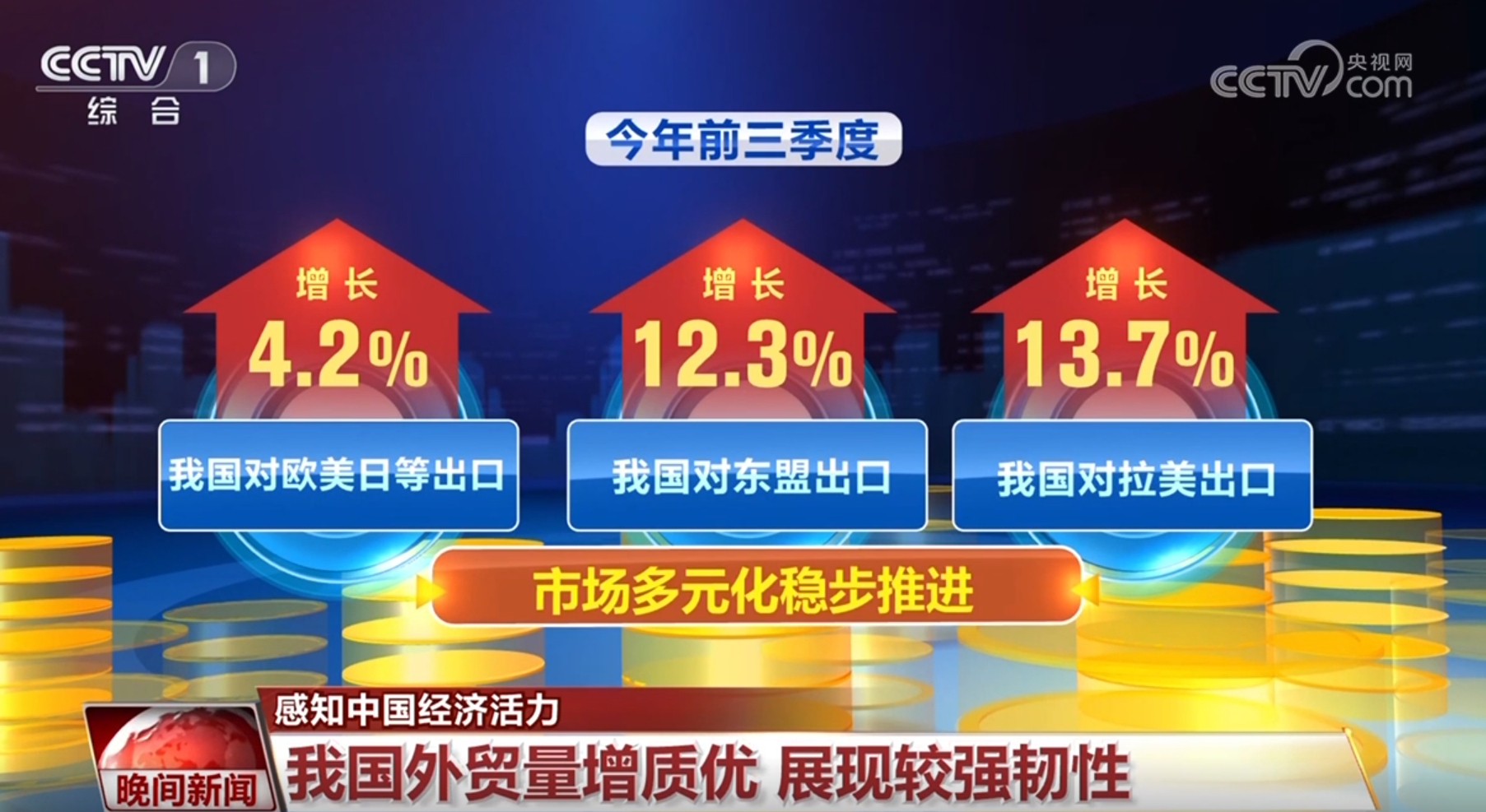 今年以來,我國外貿(mào)量增質(zhì)優(yōu),展現(xiàn)較強(qiáng)韌性。世貿(mào)組織最新數(shù)據(jù)顯示:上半年我國出口國際市場份額為14.3%,同比提高0.4個百分點(diǎn)。前三季度,我國與160多個國家和地區(qū)貿(mào)易實(shí)現(xiàn)增長,對歐美日等傳統(tǒng)市場出口增長了4.2%,對東盟、拉美等新興市場出口分別增長了12.3%和13.7%,市場多元化穩(wěn)步推進(jìn)。在深圳鹽田港,僅今年前9個月就新增了16條航線。