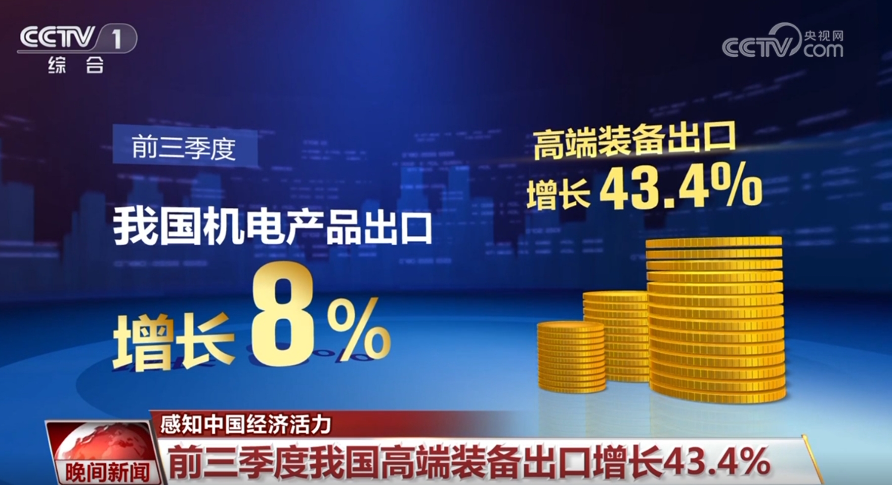 此外,創(chuàng)新也讓中國制造更受青睞。前三季度,我國機(jī)電產(chǎn)品出口增長8%,占出口總值的59.3%。其中,高端裝備出口增長43.4%,集成電路、船舶、通用機(jī)械等高技術(shù)、高附加值產(chǎn)品出口實(shí)現(xiàn)兩位數(shù)增長,外貿(mào)結(jié)構(gòu)持續(xù)優(yōu)化。