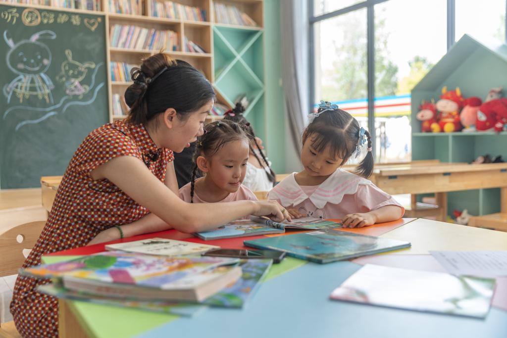 2024年9月25日,在重慶市江津區(qū)珞璜鎮(zhèn)碑亭社區(qū),社區(qū)居民郭明會(huì)(左一)帶著小孩閱讀用社??ń栝喌膱D書。新華社記者 黃偉 攝