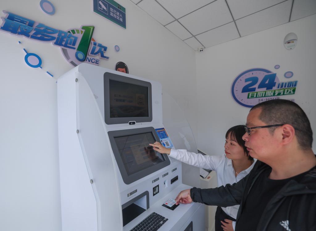2024年5月9日,在浙江省嘉興市秀洲區(qū)王江涇鎮(zhèn)便民服務(wù)中心,工作人員指導(dǎo)居民對在蘇州工作期間的社保繳費(fèi)記錄進(jìn)行自助跨省查詢。新華社記者 徐昱 攝