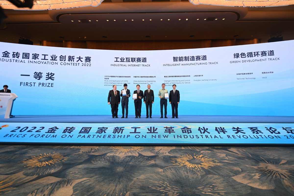 2022年9月7日,2022金磚國(guó)家工業(yè)創(chuàng)新大賽一等獎(jiǎng)獲得者和頒獎(jiǎng)嘉賓在廈門合影。(圖片來(lái)源:新華社)
