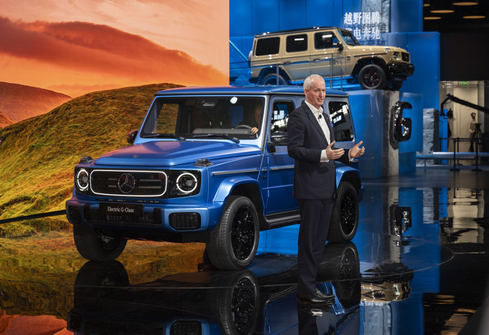 2024年4月25日,在北京中國國際展覽中心順義館舉行的2024北京車展上,梅賽德斯—奔馳集團股份公司董事會成員唐仕凱介紹梅賽德斯—奔馳純電G級越野車。新華社記者才揚攝