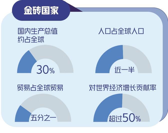 今年是“大金磚合作”開局之年。擴員后,金磚國家國內(nèi)生產(chǎn)總值約占全球30%、人口占全球人口近一半、貿(mào)易占全球貿(mào)易五分之一,金磚成色更足、分量更重、潛能更大。