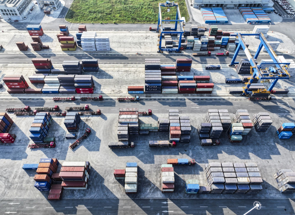 10月28日,轉(zhuǎn)運卡車在陸海新通道重慶無水港來往穿梭(無人機照片)。