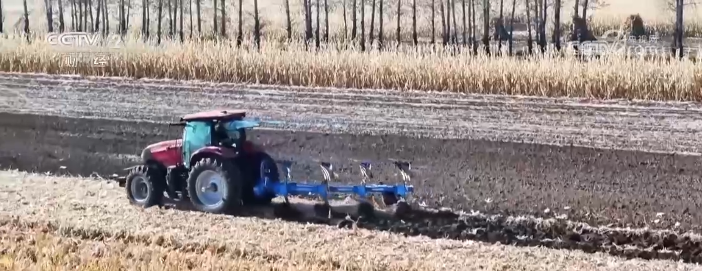 從空中看去,未收獲的地方是呈現(xiàn)金色,收割后的地面,大型的翻地機(jī)跟在后面將秸稈直接翻入地下,翻地車一過(guò)就露出油汪汪的黑土地了。這些翻完的地之后還要耙平、起壟,這樣第二年開春可以直接種植了。記者在當(dāng)?shù)夭稍L期間,看到了這些農(nóng)戶幾乎是24小時(shí)晝夜不停在進(jìn)行收割和秋整地,可以說(shuō)是“人歇機(jī)器不歇”,在搶抓農(nóng)時(shí),當(dāng)?shù)赜芯湓捊小敖鹕x田、黑色越冬”。