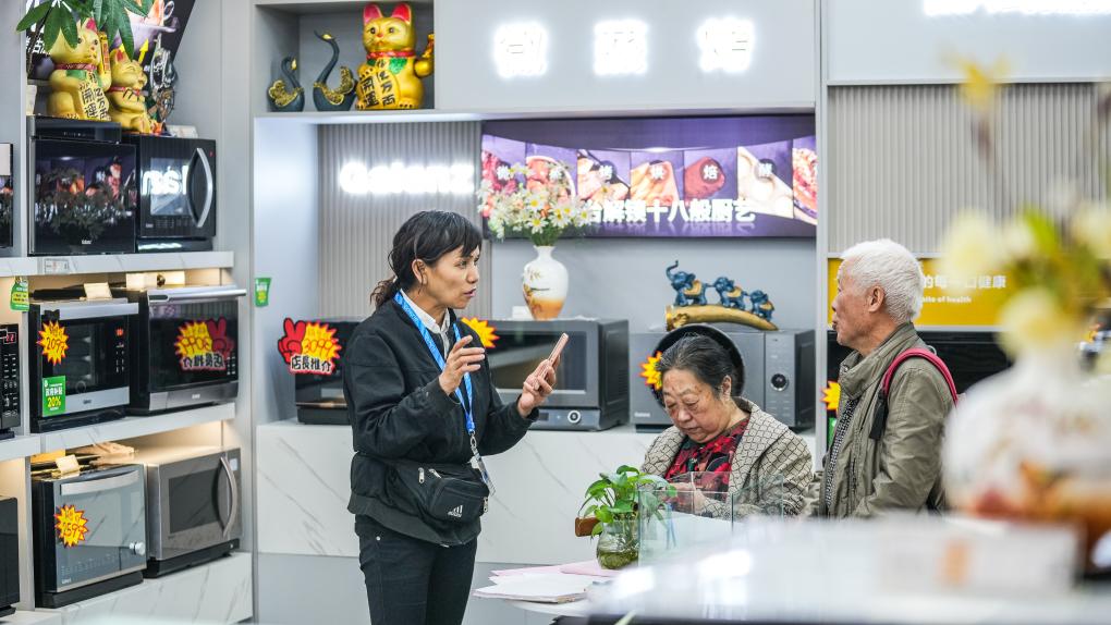 銷(xiāo)售人員在向貴陽(yáng)市民推介以舊換新商品(10月11日攝)。新華社記者 陶亮 攝