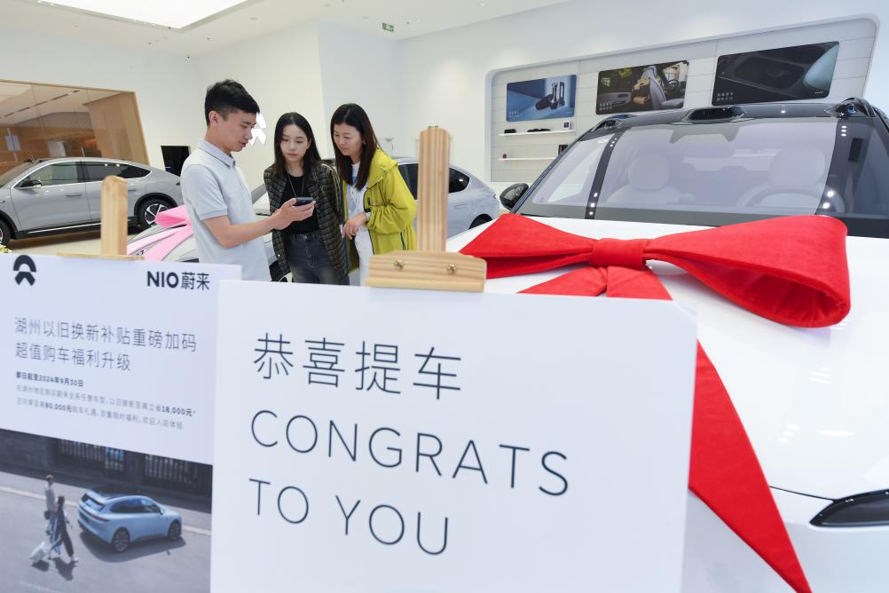 9月24日,在位于湖州市湖東街道的蔚來(lái)交付中心,銷(xiāo)售人員向顧客介紹提車(chē)后如何申領(lǐng)以舊換新補(bǔ)貼。新華社記者 翁忻旸 攝