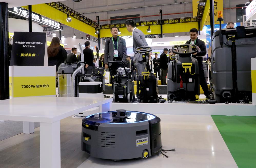 11月6日,一臺卡赫全新智能掃拖機器人RCV 5 Plus(前)在進行作業(yè)演示。這是該產(chǎn)品在進博會上的首展首發(fā)。新華社記者 方喆 攝
