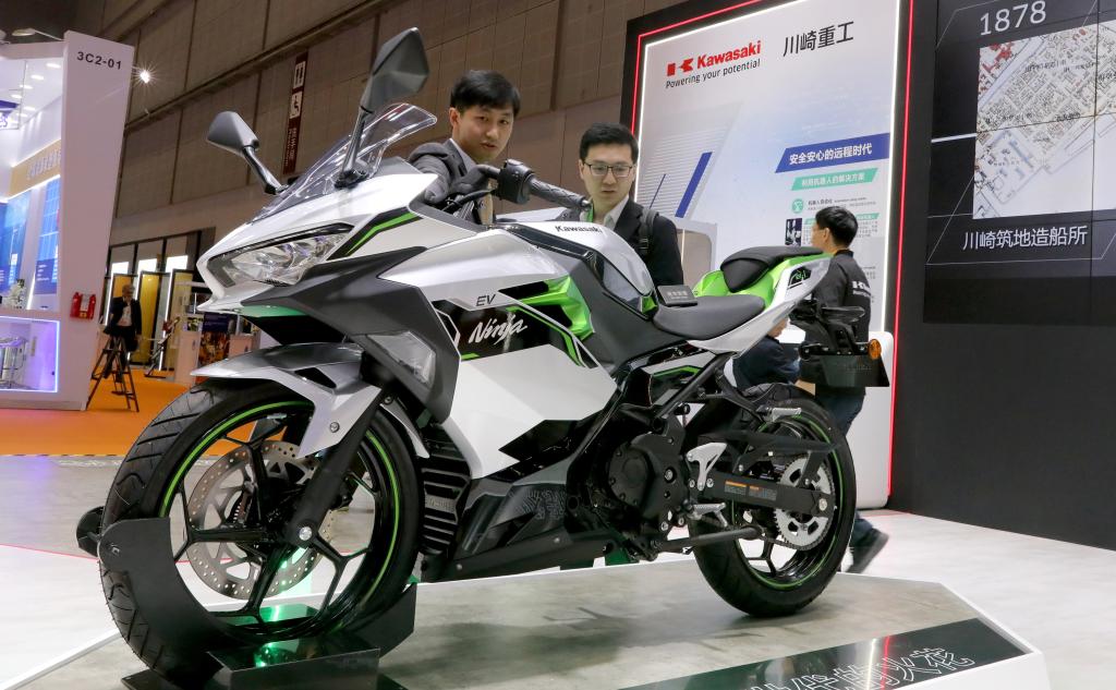 11月6日,工作人員(左)在川崎公司展臺為參觀者介紹一款電動摩托車。這是該產(chǎn)品在進博會上的首展。新華社記者 方喆 攝