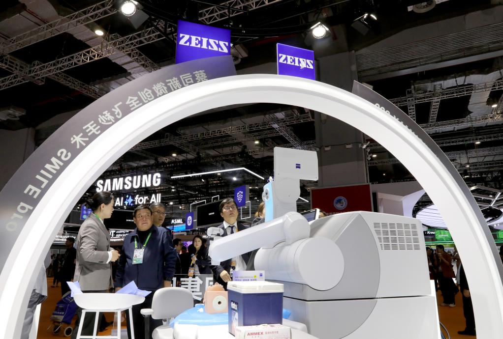 11月6日,參觀者在蔡司公司展臺展出的新一代機器人全飛秒前交流討論。這是該產(chǎn)品在進博會上的首展。新華社記者 方喆 攝