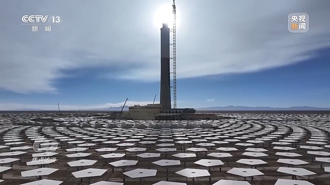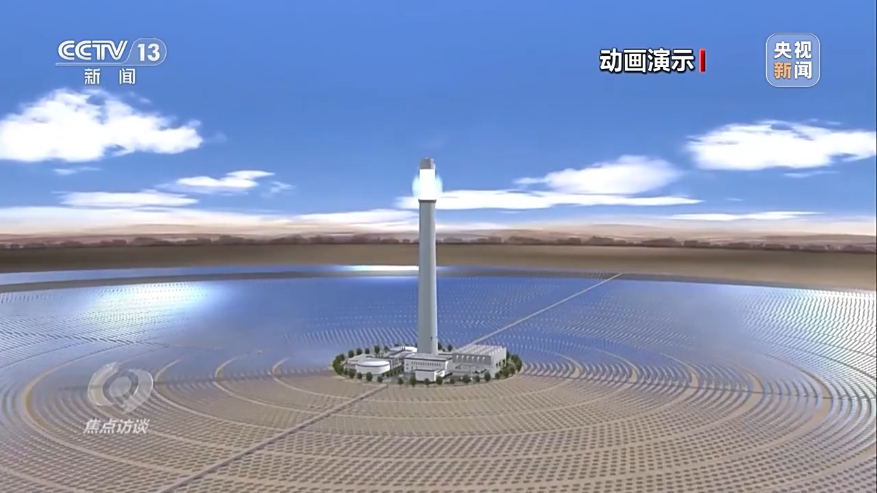 電站通過(guò)高精度智能定日鏡,實(shí)時(shí)跟蹤太陽(yáng)的運(yùn)動(dòng),將太陽(yáng)直接輻射光反射聚集到吸熱塔上,將吸熱塔內(nèi)的熔鹽加熱到560多℃的高溫,將高溫的熔鹽進(jìn)行儲(chǔ)存,在需要發(fā)電時(shí)再通過(guò)高溫熔鹽與水進(jìn)行熱交換,產(chǎn)生高溫高壓的蒸汽,驅(qū)動(dòng)汽輪發(fā)電機(jī)組發(fā)電。