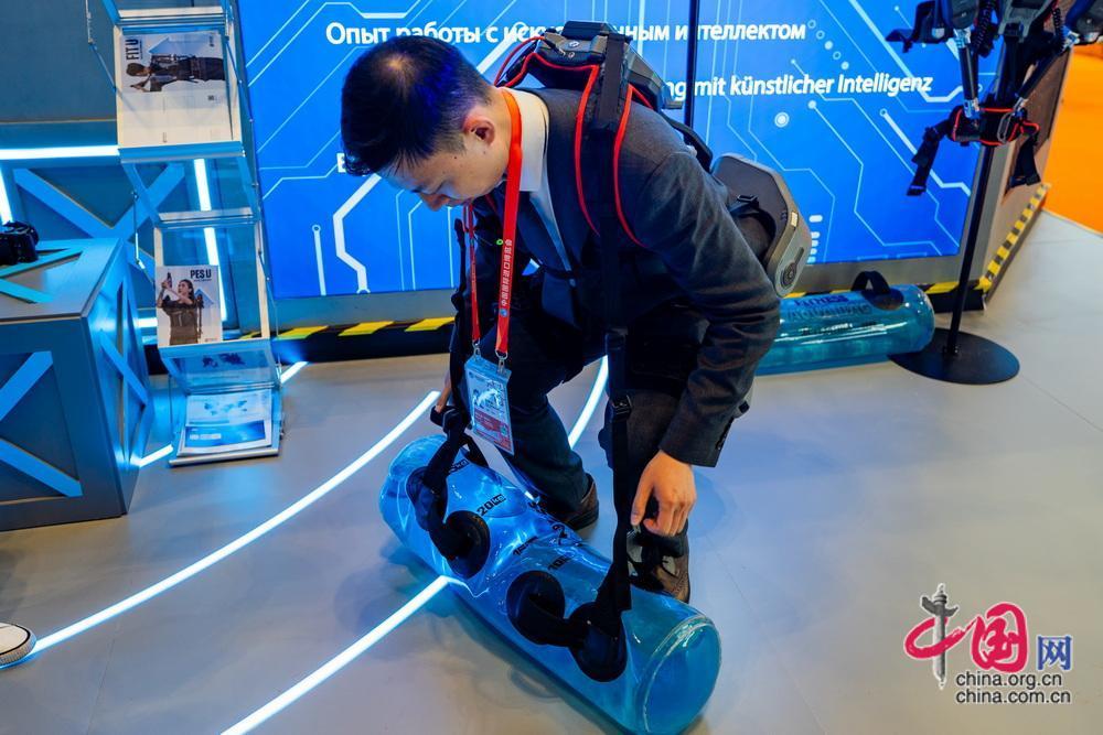 觀眾體驗外骨骼機(jī)器人在工作中的實(shí)際應(yīng)用。中國網(wǎng)記者