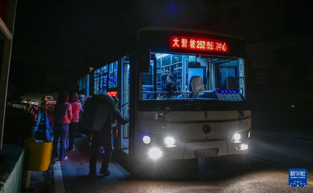在貴陽市烏當(dāng)區(qū)水田鎮(zhèn)定扒村,菜農(nóng)登上252路“惠農(nóng)專線”公交車,準(zhǔn)備進(jìn)城賣菜(11月7日攝)。