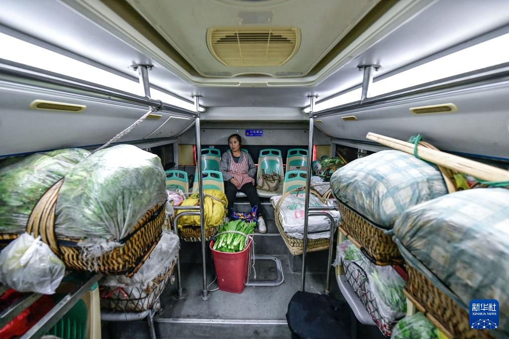 菜農(nóng)從貴陽市烏當(dāng)區(qū)水田鎮(zhèn)定扒村乘坐252路“惠農(nóng)專線”公交車進(jìn)城賣菜(11月7日攝)。