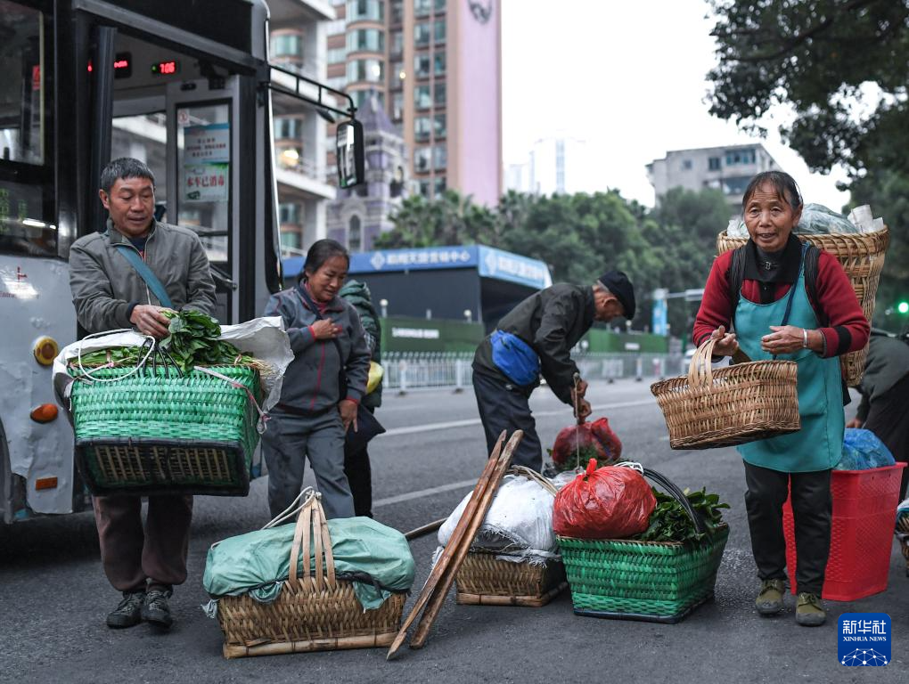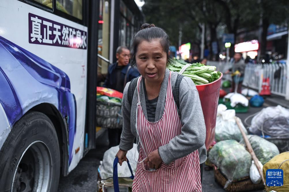 菜農(nóng)乘坐252路“惠農(nóng)專線”公交車抵達(dá)貴陽市大營坡終點站,準(zhǔn)備將蔬菜就近售賣(11月7日攝)。