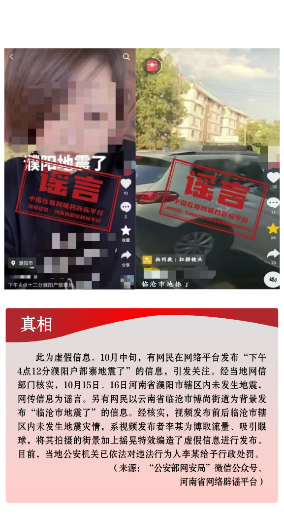 危言聳聽炒作話題。個(gè)別網(wǎng)民和自媒體編造虛假信息,炒作社會(huì)熱點(diǎn)話題,并配以具有煽動(dòng)性、誤導(dǎo)性的標(biāo)題,擴(kuò)散傳播,擾亂社會(huì)秩序。10月中旬,新疆喀什、阿克蘇地區(qū)相繼發(fā)生地震,部分自媒體罔顧事實(shí),利用AI技術(shù)拼湊網(wǎng)絡(luò)舊圖,編造完全與事實(shí)不符的地震廢墟或?yàn)?zāi)后救援圖片,混淆視聽,嚴(yán)重誤導(dǎo)網(wǎng)民。另有個(gè)別網(wǎng)民將拍攝的街景加上搖晃特效,惡意杜撰云南發(fā)生地震,引發(fā)公眾恐慌,造成不良影響。還有網(wǎng)民為給網(wǎng)店?duì)I銷引流,利用家長(zhǎng)們高度關(guān)注兒童安全話題的心理,無(wú)中生有編造“四川巴中頻繁有青少年失蹤”謠言,引發(fā)公眾焦慮恐慌。