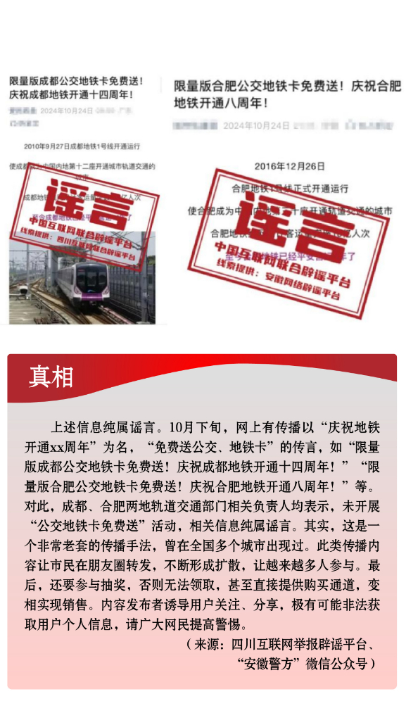 假冒官方虛構(gòu)政策。一些不法分子冒充權(quán)威機(jī)構(gòu),散布涉公共政策類謠言,誤導(dǎo)公眾認(rèn)知。有的假借官方名義,偽造政策文件,實(shí)則行騙牟利,侵犯群眾利益。如有人利用公眾對(duì)“大數(shù)據(jù)”“數(shù)字經(jīng)濟(jì)”等內(nèi)容的認(rèn)知盲區(qū),假借“國(guó)家數(shù)據(jù)局”“中國(guó)人民銀行數(shù)字貨幣研究所”等官方名義,偽造政策文件,謠稱“國(guó)家數(shù)據(jù)局頒發(fā)‘個(gè)人數(shù)據(jù)資產(chǎn)擁有權(quán)確權(quán)憑證’”“數(shù)字人民幣平臺(tái)將發(fā)放‘?dāng)?shù)字資產(chǎn)紅利’”,相關(guān)部門均已發(fā)布辟謠聲明。有的從公開發(fā)布的政策信息中摘取碎片化信息,斷章取義,對(duì)政策歪曲解讀。如個(gè)別自媒體故意混淆“個(gè)人養(yǎng)老金”與“基本養(yǎng)老金”的概念,傳播“領(lǐng)取養(yǎng)老金要繳3%個(gè)稅”“養(yǎng)老金個(gè)稅起征點(diǎn)為5000元”等不實(shí)信息,引發(fā)公眾誤解。另有“成都、合肥等地免費(fèi)送公交地鐵卡”謠言,以“免費(fèi)”“贈(zèng)送”為噱頭,誘導(dǎo)用戶關(guān)注、分享,最終可能導(dǎo)致用戶遭受個(gè)人信息泄露或其他不法侵害。