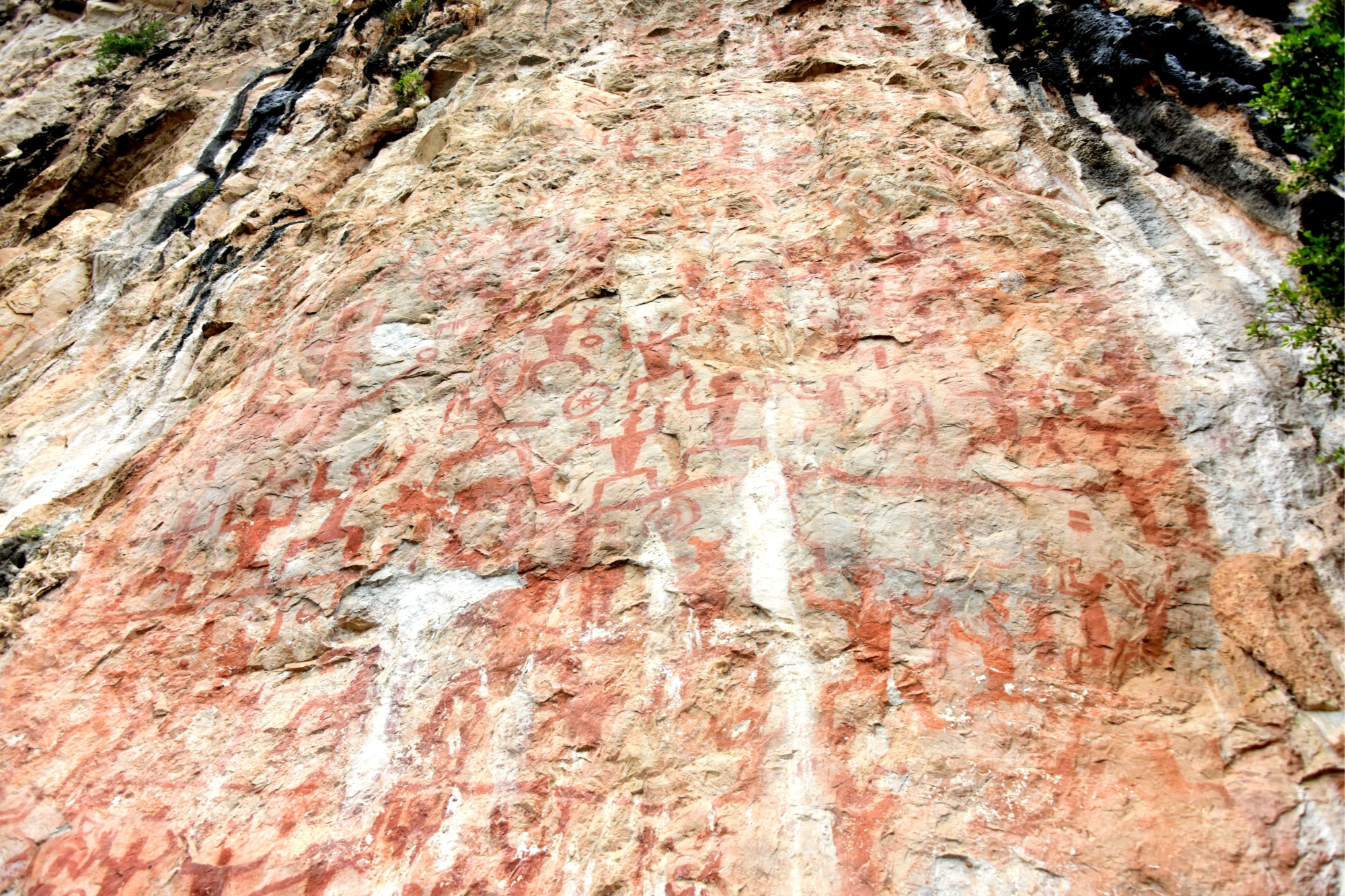 花山,坐落于崇左市寧明縣城西北約25公里的明江河畔,以其古老神奇的巖畫而聞名海內(nèi)外?;ㄉ綆r畫距今已有2000多年的歷史,刻著人、獸、銅鼓、刀劍、羊角鈕鐘等造型各異的赭紅色圖像,記錄著壯族先民古駱越人的生活、生產(chǎn)和宗教信仰,為中國(guó)首個(gè)巖畫類世界文化遺產(chǎn)。