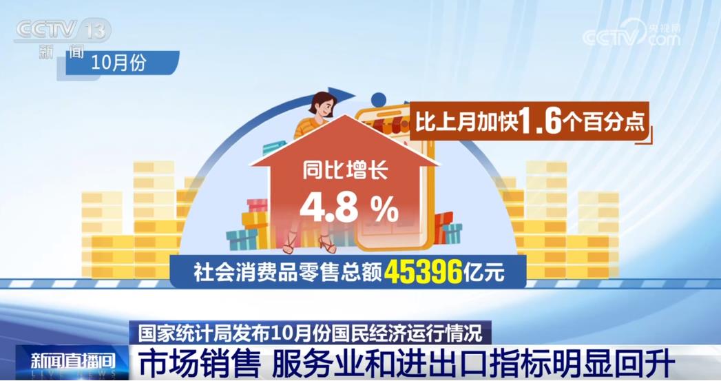 先說(shuō)“三個(gè)回升”,10月份,市場(chǎng)銷(xiāo)售、服務(wù)業(yè)和進(jìn)出口三個(gè)指標(biāo)明顯回升。從市場(chǎng)銷(xiāo)售看,受消費(fèi)品以舊換新政策帶動(dòng),10月份社會(huì)消費(fèi)品零售總額同比增長(zhǎng)4.8%,增速比上月加快1.6個(gè)百分點(diǎn),其中服務(wù)零售增勢(shì)依然較好。