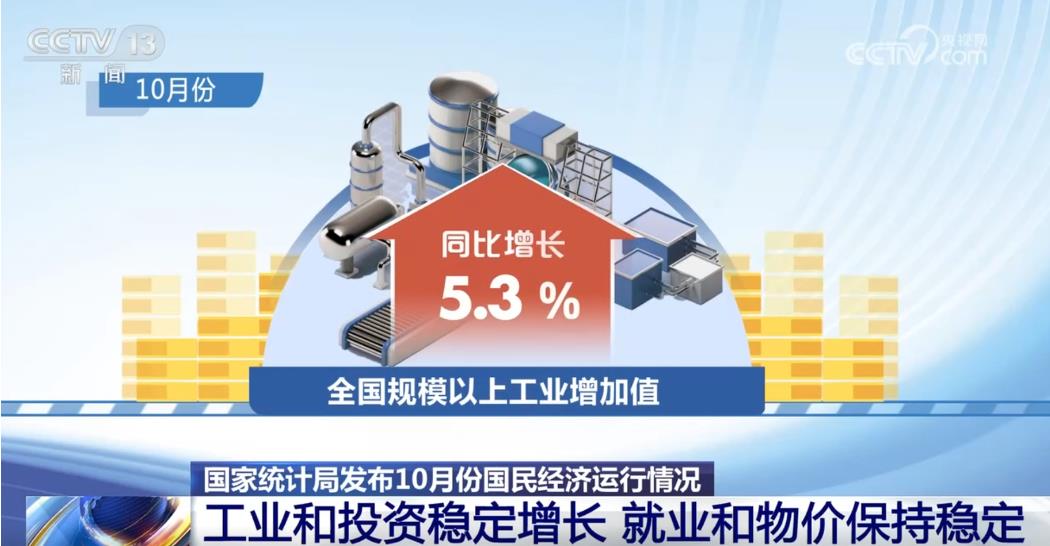 再說(shuō)“兩個(gè)穩(wěn)定”,一是工業(yè)和投資穩(wěn)定增長(zhǎng),二是指就業(yè)和物價(jià)保持穩(wěn)定。從工業(yè)來(lái)看,在大規(guī)模的設(shè)備更新以及產(chǎn)業(yè)升級(jí)發(fā)展等因素驅(qū)動(dòng)下,10月份規(guī)模以上工業(yè)增加值同比增長(zhǎng)5.3%,繼續(xù)保持較快增長(zhǎng),其中制造業(yè)升級(jí)發(fā)展態(tài)勢(shì)明顯。