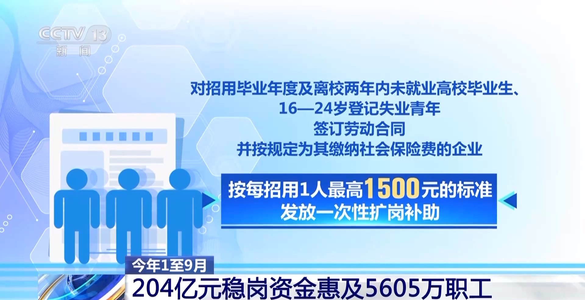對(duì)招用畢業(yè)年度及離校兩年內(nèi)未就業(yè)高校畢業(yè)生、16到24歲登記失業(yè)青年,簽訂勞動(dòng)合同,并按規(guī)定為其繳納社會(huì)保險(xiǎn)費(fèi)的企業(yè),按每招用1人最高1500元的標(biāo)準(zhǔn)發(fā)放一次性擴(kuò)崗補(bǔ)助,今年以來已向17萬戶企業(yè)發(fā)放9億元,惠及62萬高校畢業(yè)生等青年群體。