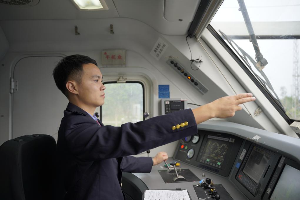 作為第10萬列中歐班列的駕駛員,李峰穩(wěn)步登上駕駛室,緩解制動(dòng)機(jī)、推動(dòng)前進(jìn)手柄……熟練地完成一系列發(fā)車前準(zhǔn)備工作,列車緩緩啟動(dòng)。
