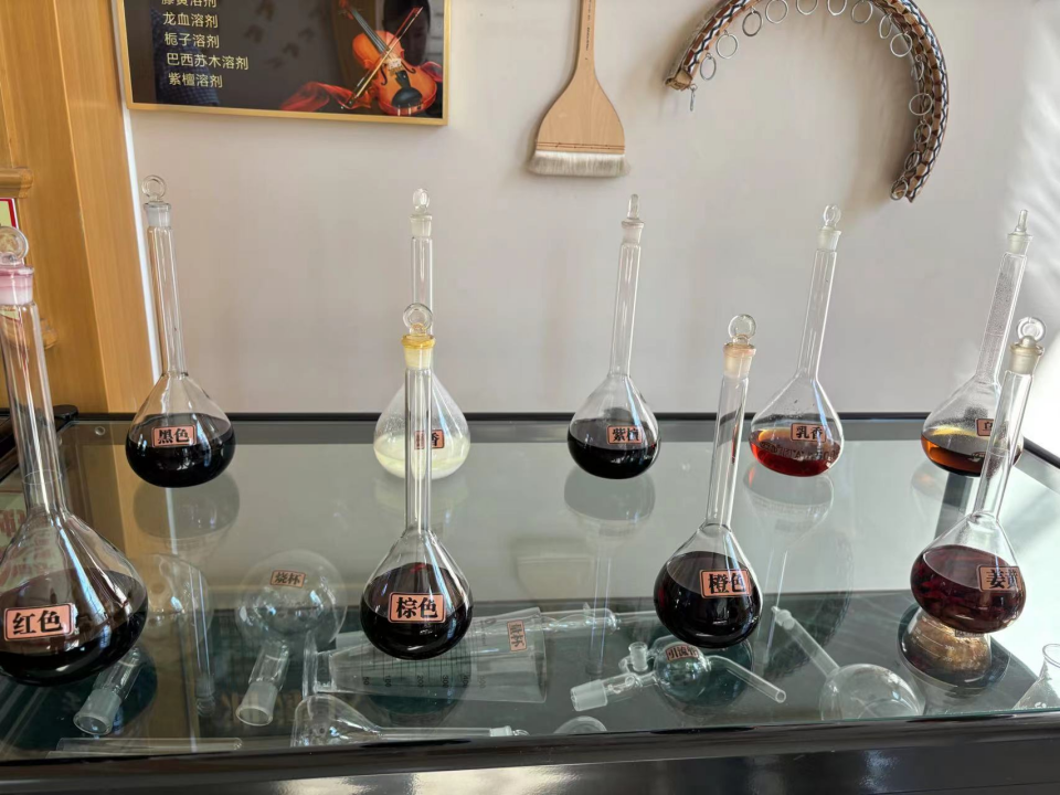 但現(xiàn)在東高村鎮(zhèn)的提琴,都用上了天然的“綠色漆”。華東樂(lè)器的展柜里,擺放著“姜黃”“紫檀”“松香”等各色油漆玻璃瓶。