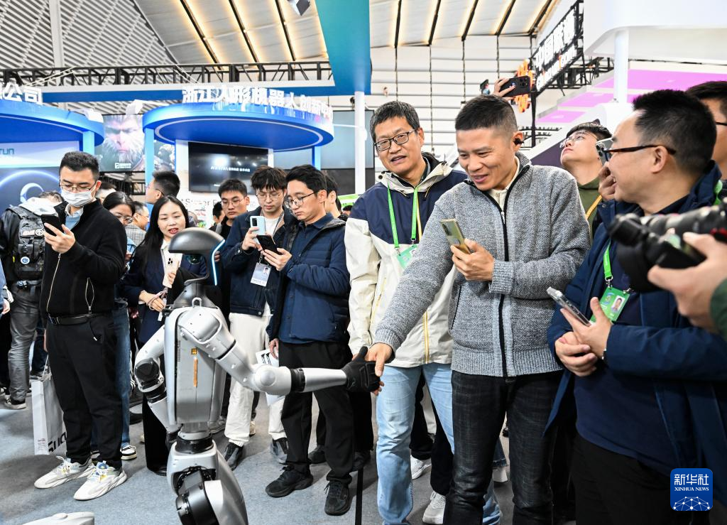 11月19日,在2024年世界互聯(lián)網(wǎng)大會“互聯(lián)網(wǎng)之光”博覽會上,一臺人形機(jī)器人(右一)與參觀者互動。